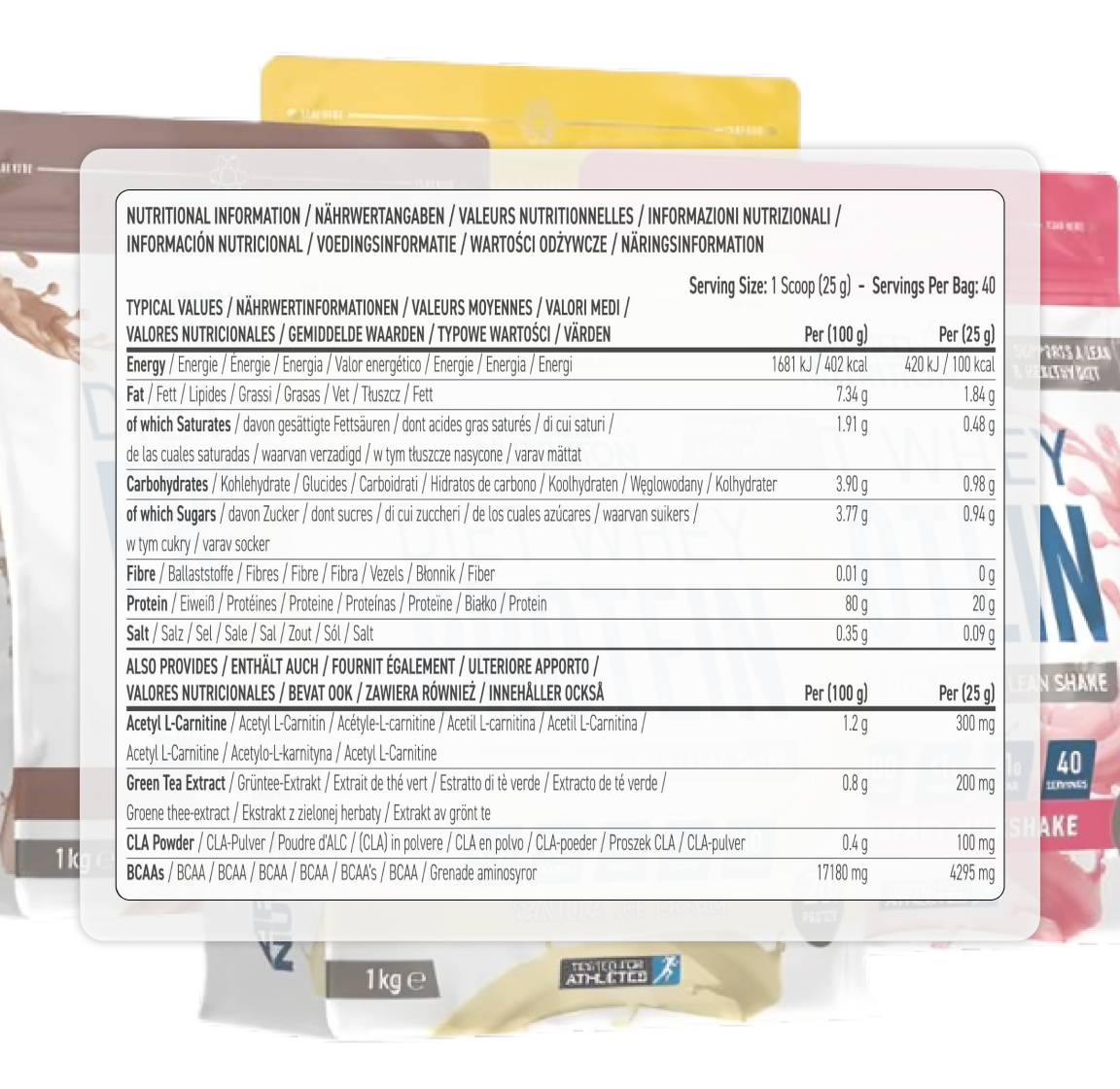 Mieszanka białek serwatkowych (mleko) (94%) (koncentrat białka serwatki i izolat białka serwatki), naturalny aromat, CLA w proszku, acetyl L-karnityna, ekstrakt z zielonej herbaty, AstraGin (Panax notoginseng, Astragalus membranaceus), substancje słodzące: sukraloza, glikozydy stewiolowe ze stewii; żywność barwiąca: kurkumina.